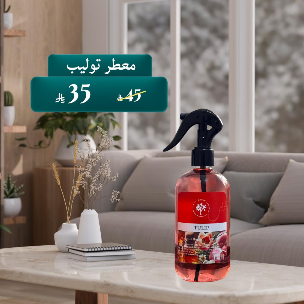 معطر توليب ينثر عبير الزهور الرقيقة في أرجاء المكان كأنك وسط حديقة من التوليب المتفتح، كل رشة منه تضفي على الجو دفءً ونعومة وتغمر المكان بلمسة رومانسية شاعرية تحاكي لحظات الصفاء والجمال الطبيعي